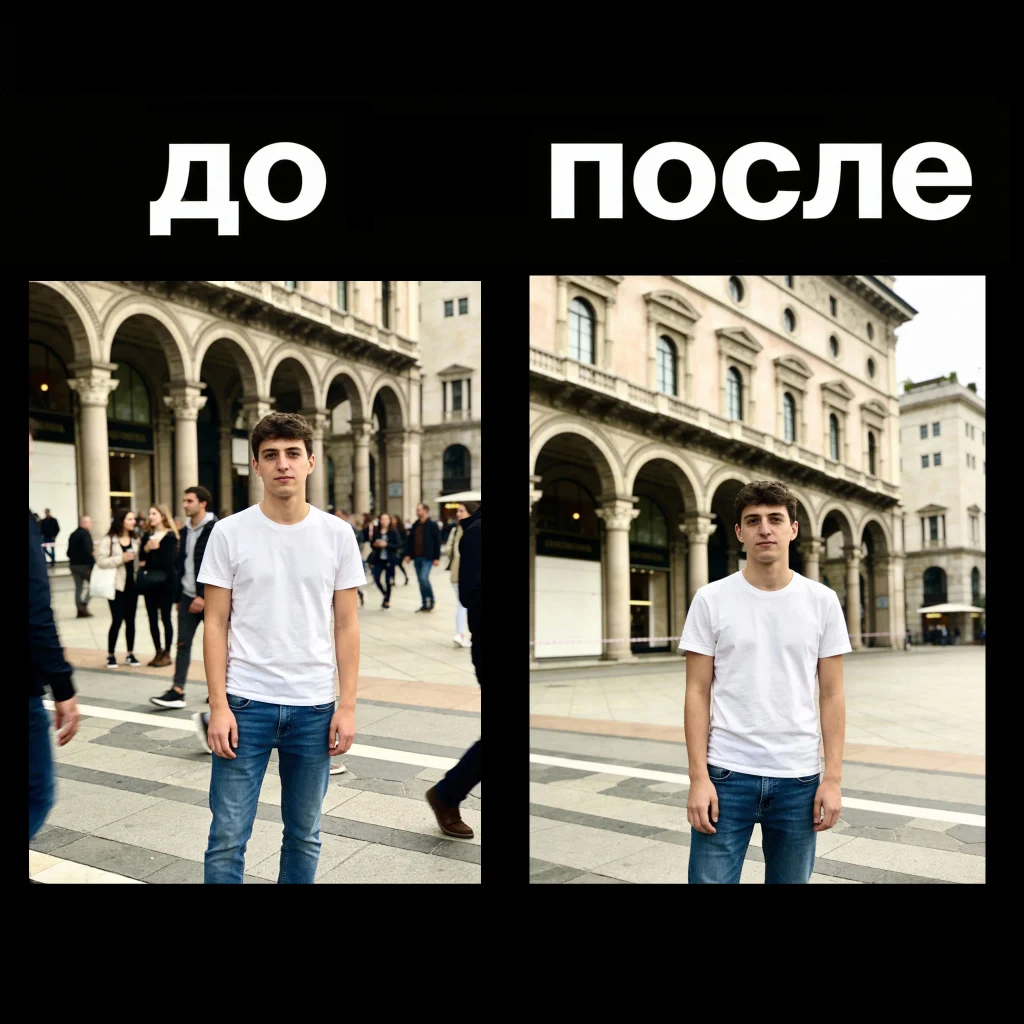 Удаление всех лишних людей с фотографии при полном сохранении сцены, объектов, архитектуры, природы и деталей окружения. Главный персонаж (или главная группа) остаётся неизменной. Никакие предметы и элементы фона не изменяются.