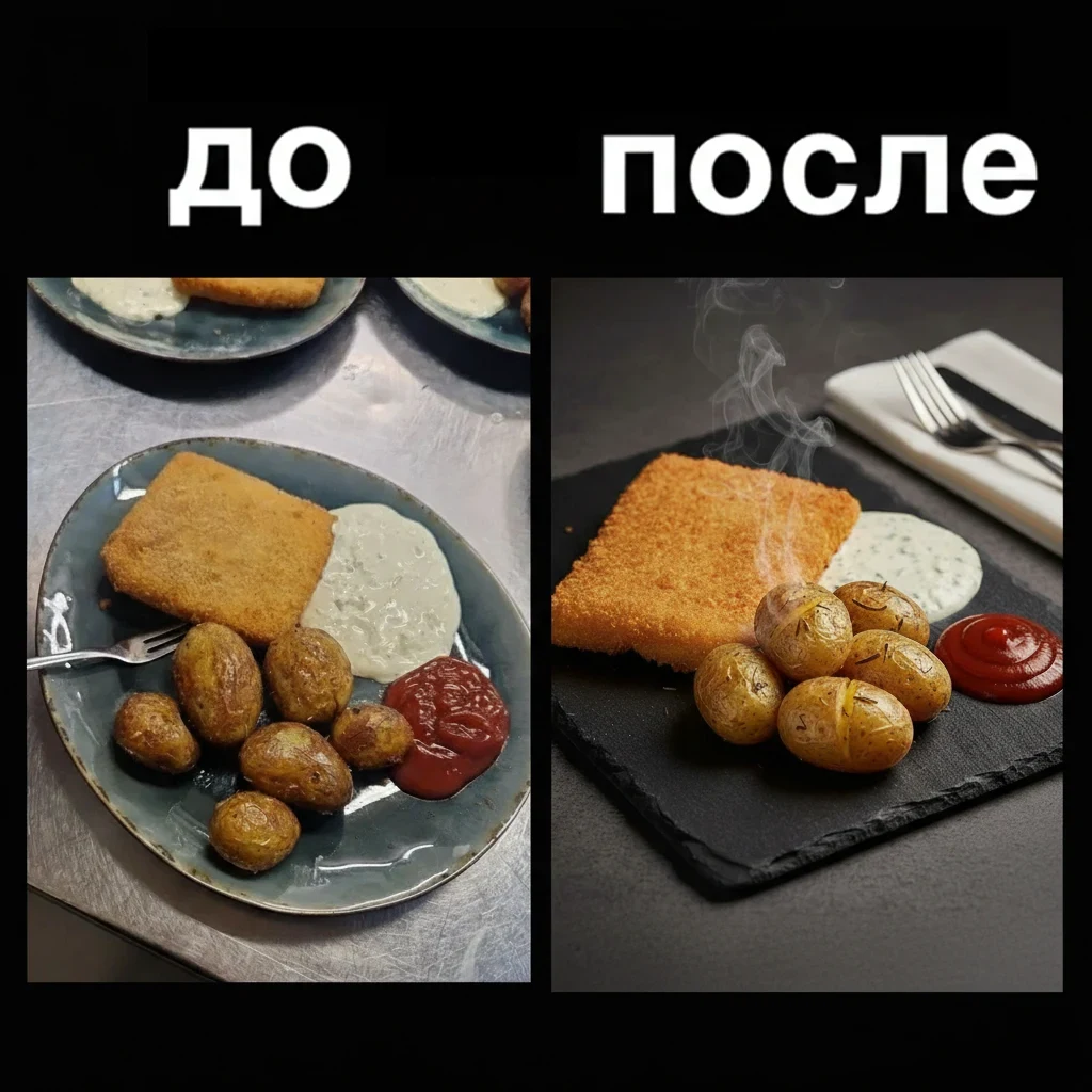 С помощью искусственного интеллекта превратите обычное фото блюда в профессиональную рекламную карточку для меню ресторана премиум-класса. Просто загрузите фотографию еды — и получите коммерческую обработку, студийный свет, фотореалистичную ретушь, точную цветопередачу и готовый визуал для сайта ресторана, доставки, печатного меню, социальных сетей и онлайн-рекламы.