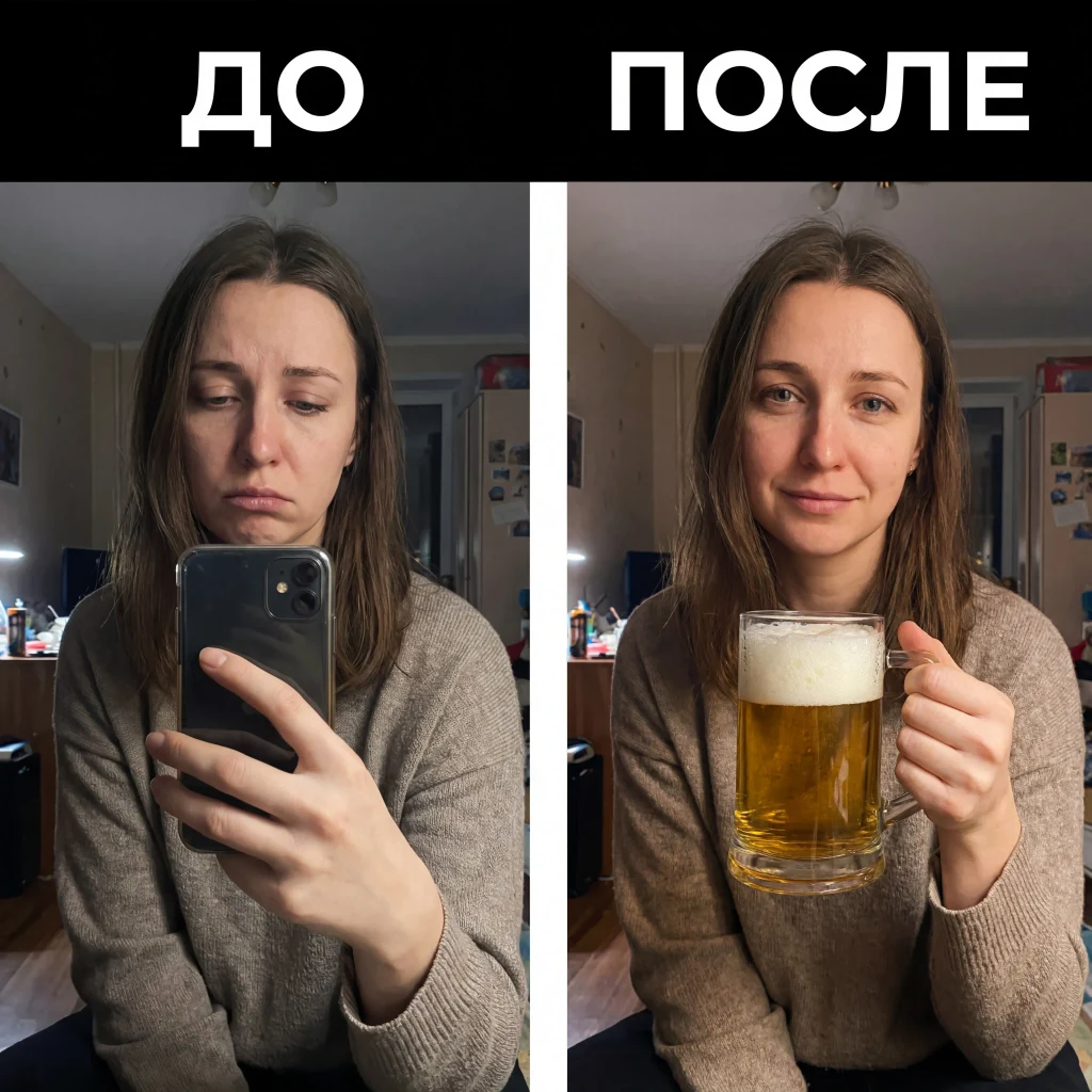 Тихий момент человеческого удовольствия. Человек с кружкой свежего пива — не ради позы и не ради эффекта, а как часть естественного, тёплого состояния. Счастье выражено не улыбкой, а расслабленностью, покоем и внутренним комфортом. Кадр про простую радость жизни без показухи.