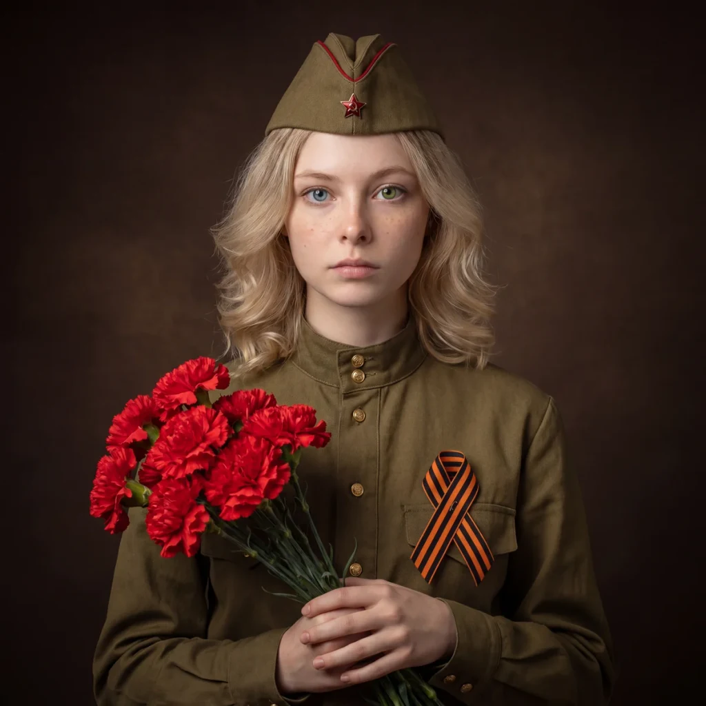 Универсальный промт для преобразования любого фото в торжественный портрет ко Дню Победы. Работает с мужчинами, женщинами и группами. Сохраняет лица, автоматически подбирает форму по полу, добавляет георгиевскую ленту и красные гвоздики.