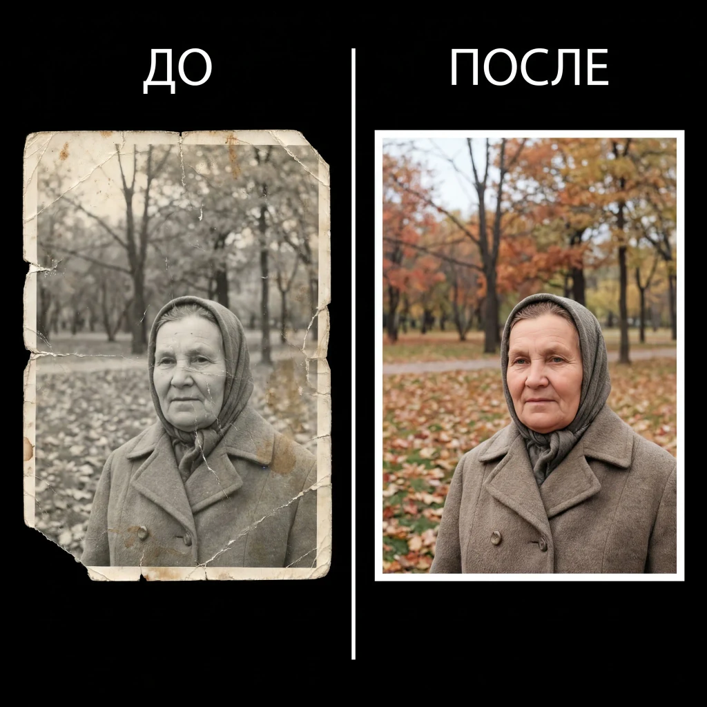 Аккуратное восстановление старой фотографии с деликатной колоризацией. Сохраняется идентичность человека, возраст, черты лица, выражение и историческая достоверность. Никакой ретуши, омоложения или «улучшения» внешности.