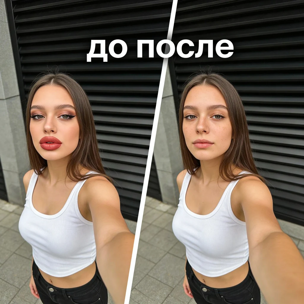Удаление цифровых улучшений, татуировок, макияжа и ретуши. Возвращение естественной текстуры кожи, реальных пропорций и исходного освещения. Итог — честное изображение без фотошопа и эстетических манипуляций.